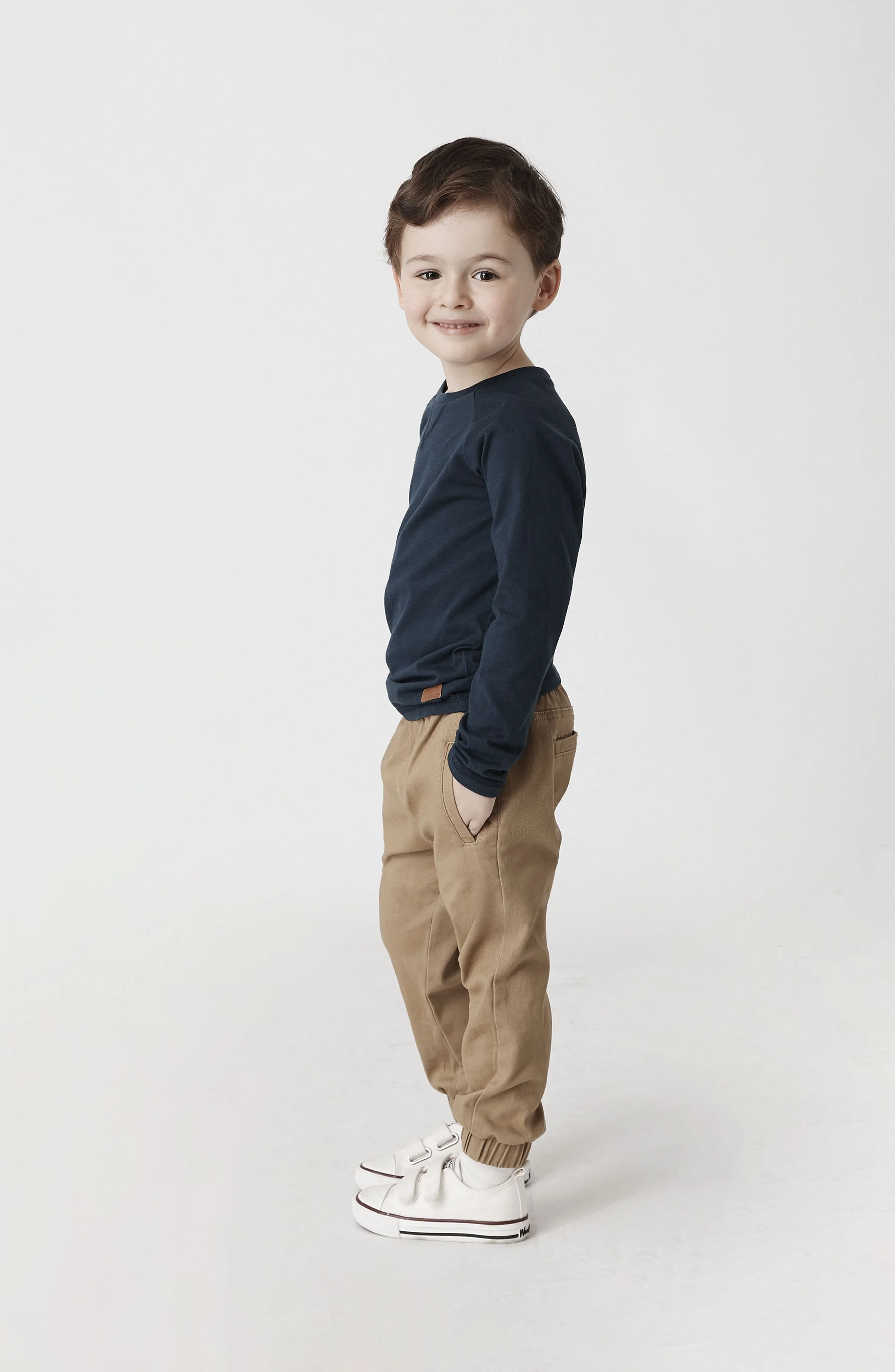 Smiling child in blue top and khaki pants with hands in pockets, standing sideways.