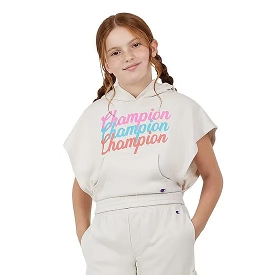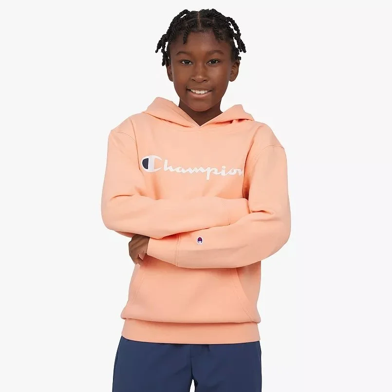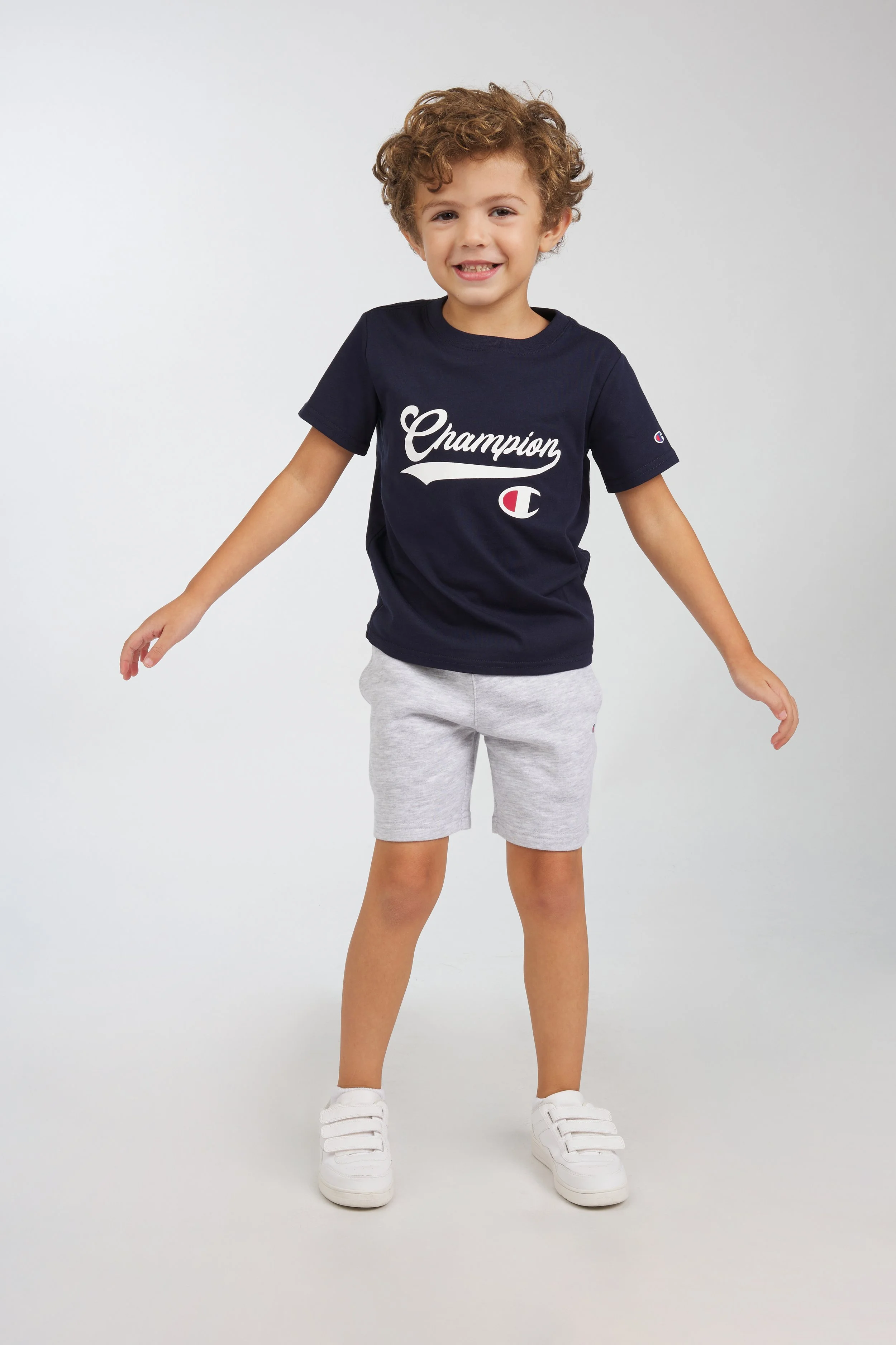 Child wearing a black Champion shirt and gray shorts with white sneakers