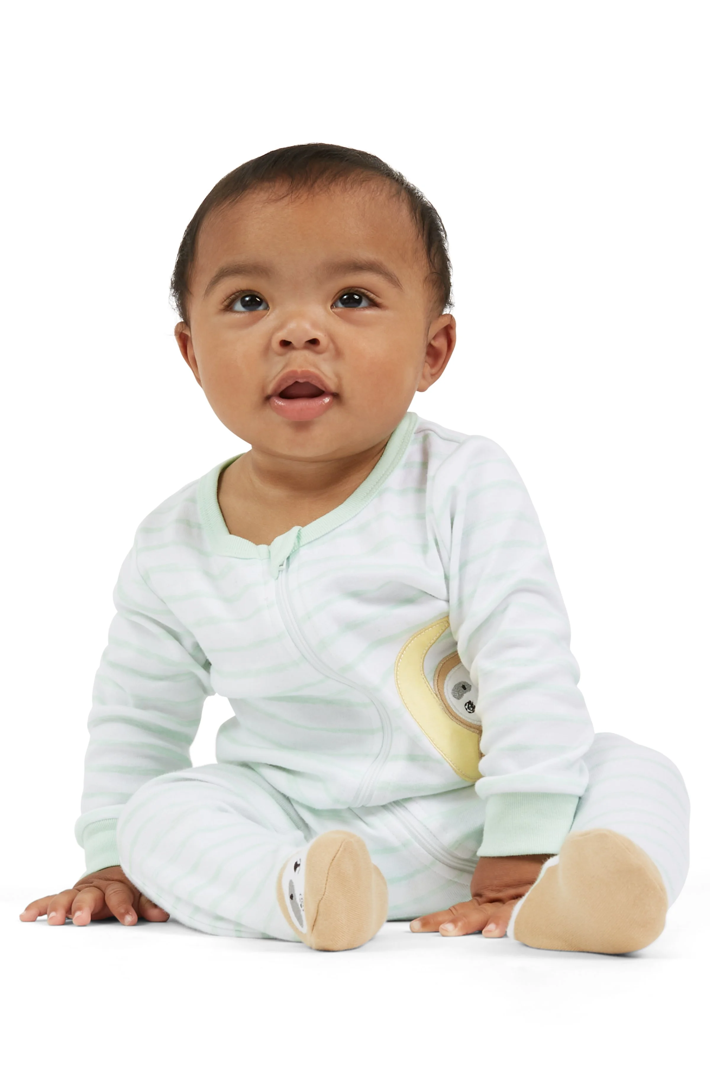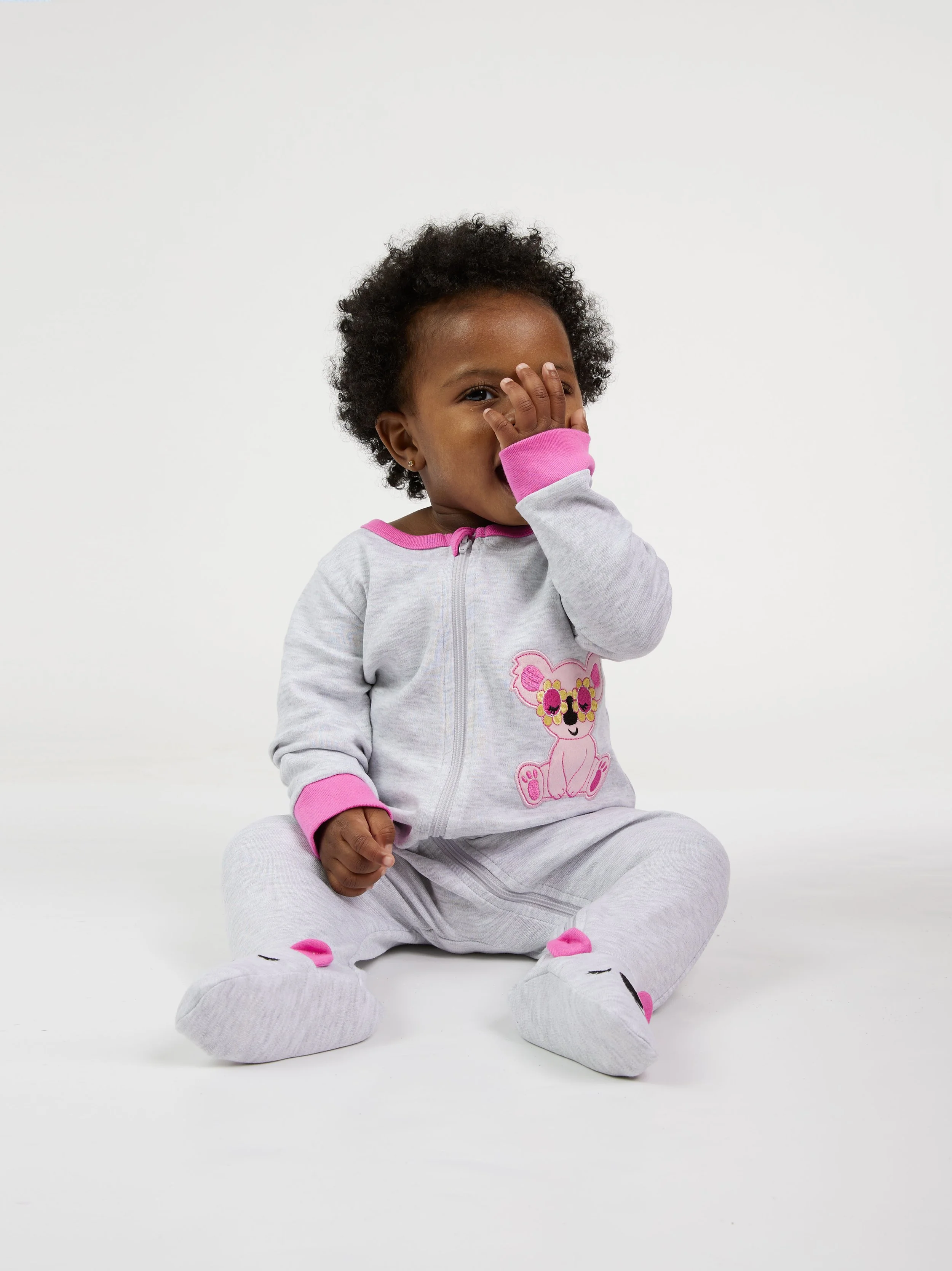 Baby in grey onesie with pink accents and koala design sitting on floor.