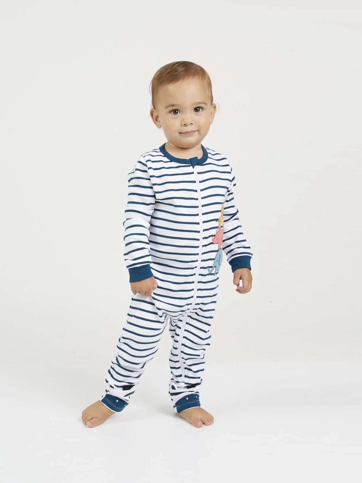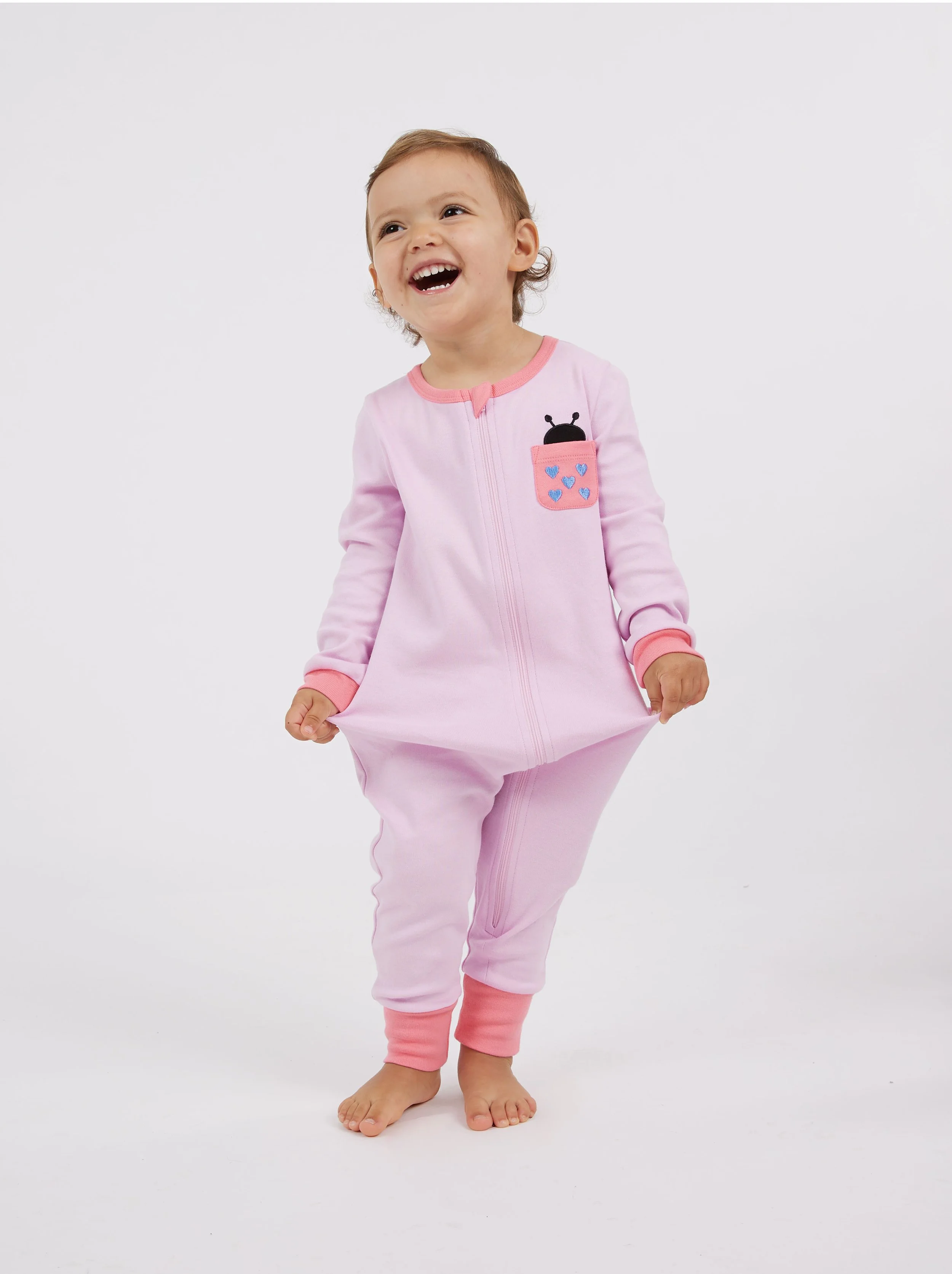 Smiling toddler wearing a light pink onesie with a ladybug and hearts design on the pocket.