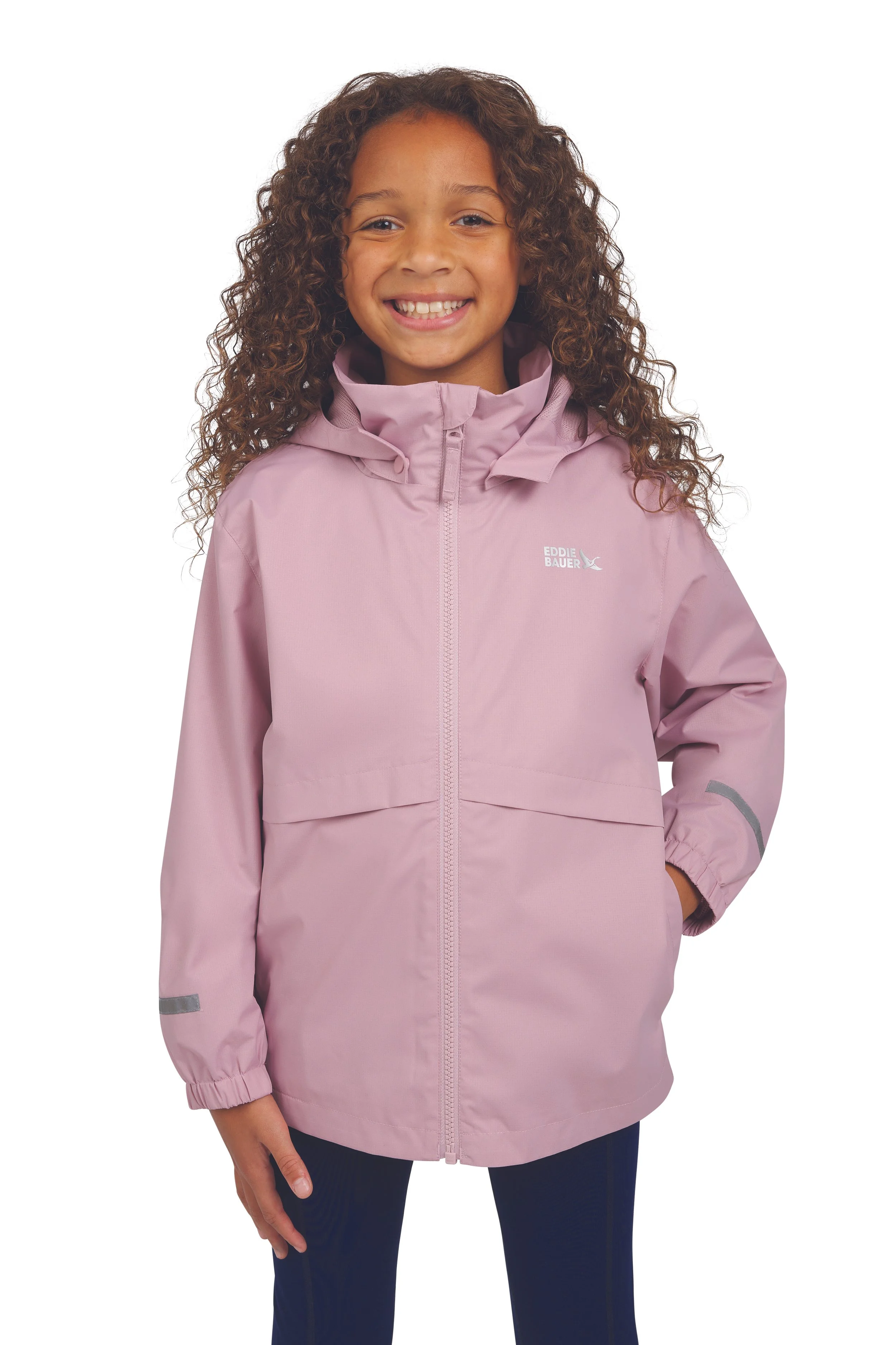 Child wearing a pink Eddie Bauer jacket, smiles, hands in pockets