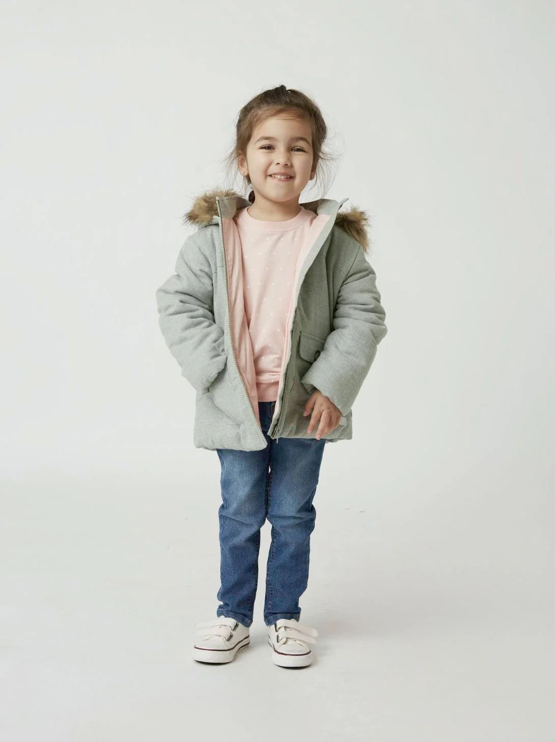 Child wearing a gray jacket with fur hood, pink shirt, blue jeans, and white sneakers, smiling in a studio setting.