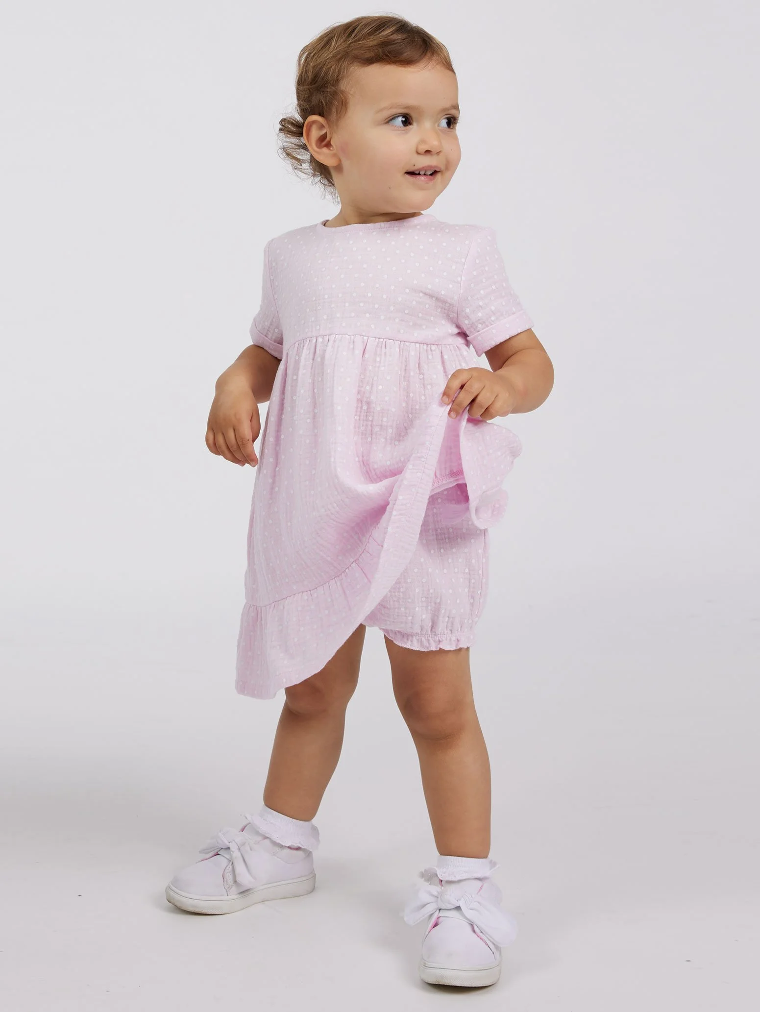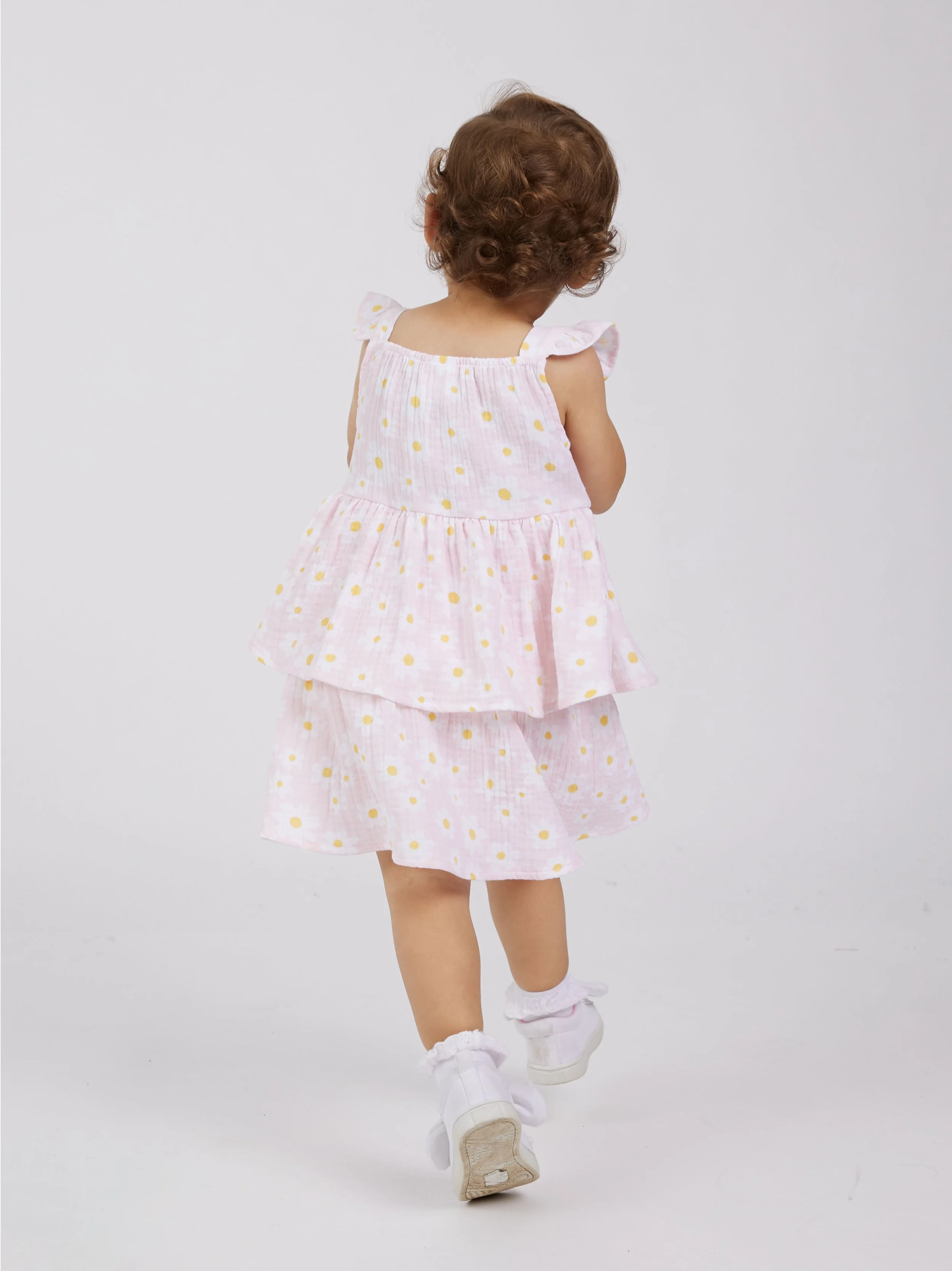 Toddler in pink polka dot dress, back view, walking, wearing white shoes with frilly socks.