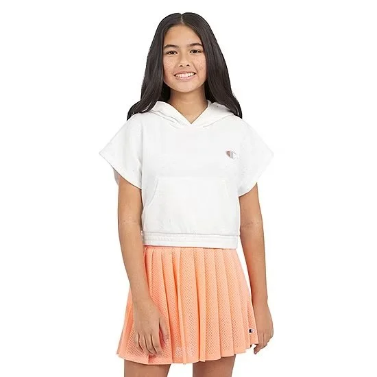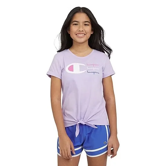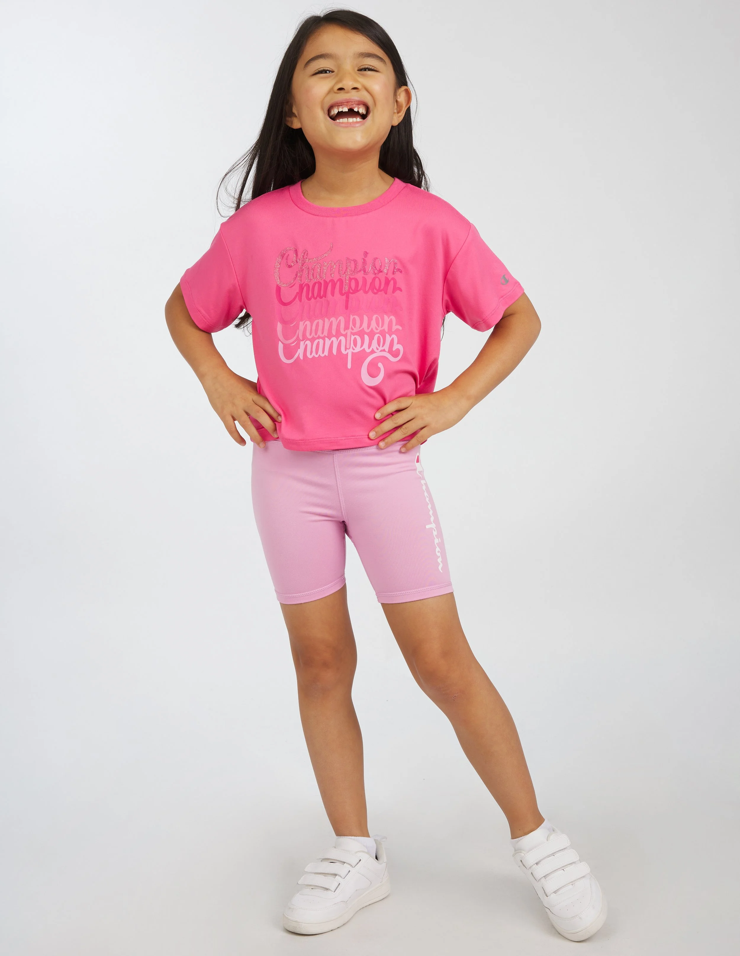 Child wearing pink Champion t-shirt and shorts, posing happily in white sneakers.