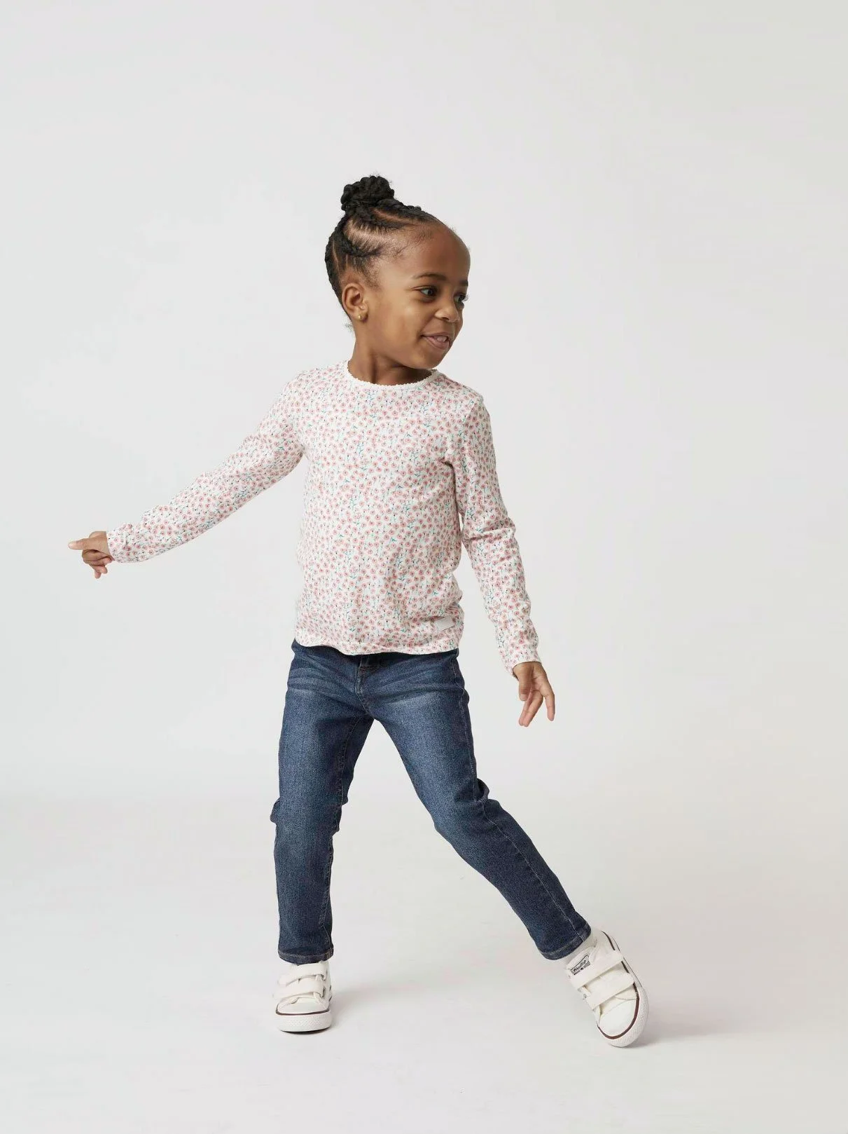 Child wearing floral shirt, jeans, and sneakers, standing on one leg with a playful pose against a white background.